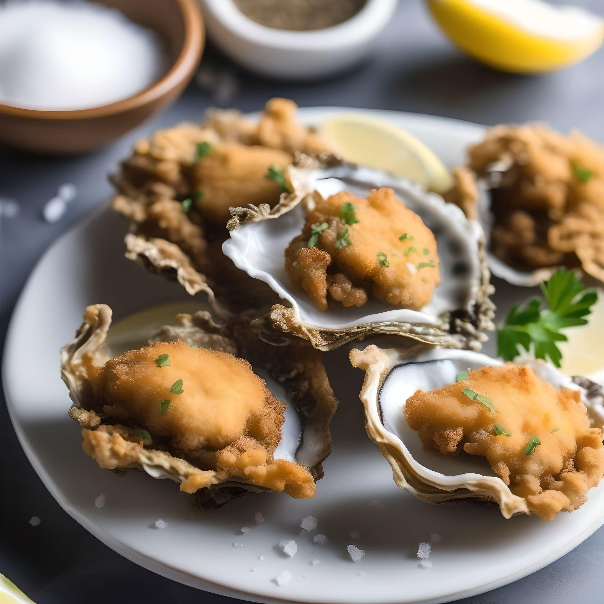 ¾ cup of flour ½ teaspoon baking powder 1/3 cup water 1 egg ¼ teaspoon salt Cook the oysters in boiling water for one minute; remove and drain. Mix the oysters with the salt pepper and one tablespoon of flour. In another bowl mix all of the rest of the ingredients to form a paste. Heat a wok or large pot with oil. Coat the oysters with the paste and deep fry for three minutes until golden brown. Remove from the oil and drain on a paper towel. Serve with peppercorns ground up with salt.