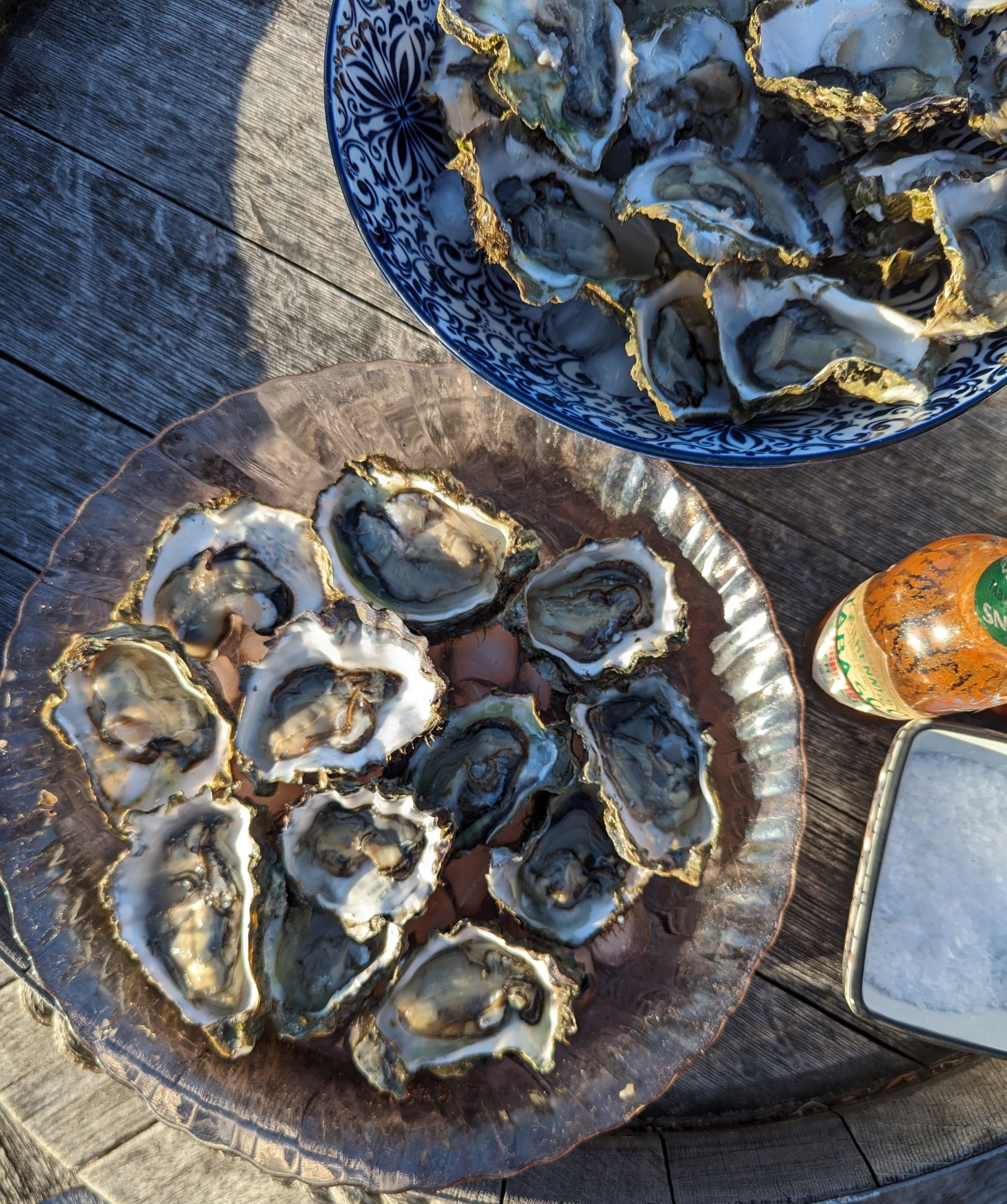 At the moment they are at their best in the Sounds- plump and creamy. We have an over-abundance of them on our beach. They have established themselves so well this year, that they have actually taken over the beach to the point where we are thinking of raking them all off and dumping them. The shells are sharp and cut feet, harvesting hands and dog paws badly. Mind you that doesn’t stop Frankie from heading into the muddiest part of the beach and scraping oysters off semi-submerged branches and eating them. I swear that dog can sniff out when they are at their prime. Harvesting them here is easy- the shucking a bit trickier. A good shucking knife helps and maybe even a strong gardening glove. One of my neighbours freezes the fresh oyster in the shell and when she takes them out to eat they open up, making it easier to get the oyster out. The naturally occurring oysters on our beach are quite misshapen which makes them harder to shuck. Graeme has successfully “farmed” oysters from spat in a burley cage dangling off the jetty, which makes for more even smoother oysters.